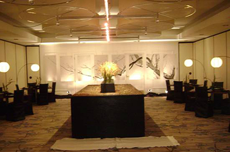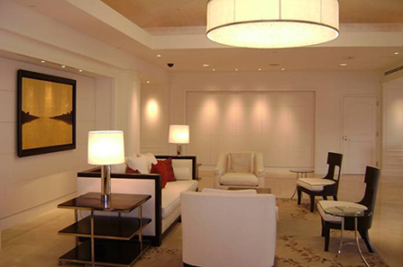 Line drum chandeliers were sent in for the ballroom that required extensive scaffold set-up to accommodate the 10 electricians needed to install them. Workers had to be very cautious not to disturb or destroy the hand-woven carpets from Africa, the one-of-a-kind artwork, or any of the lavish furnishings they had to workaround.